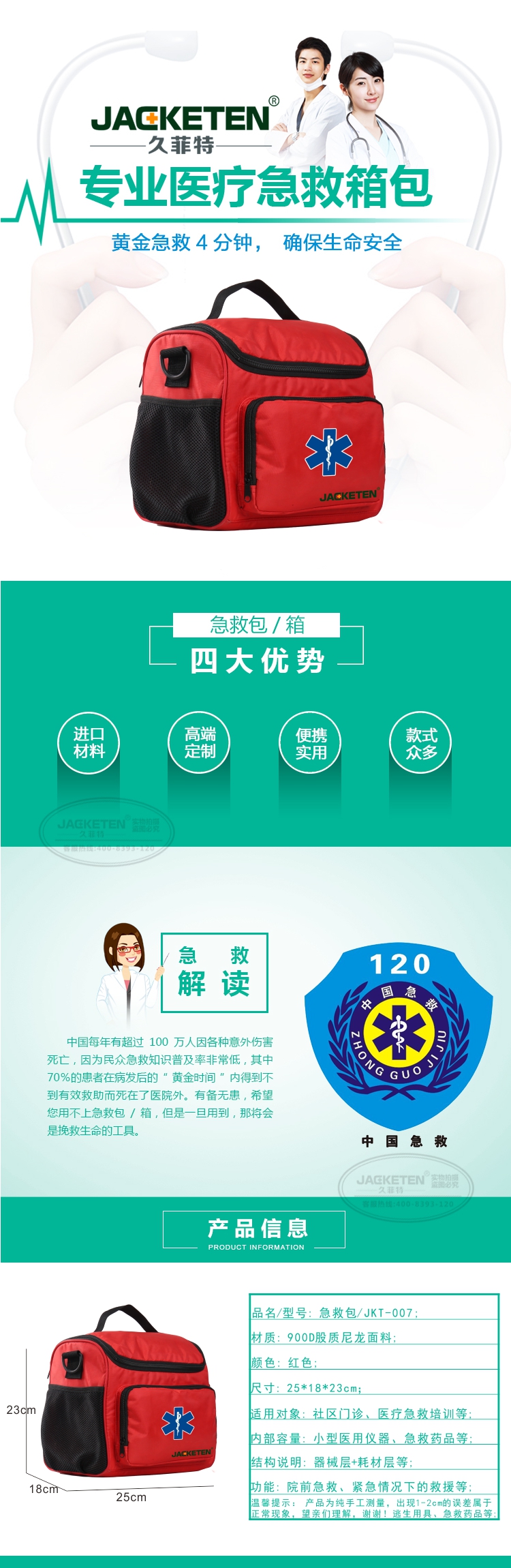 品名/貨號(hào):急救包/JKT-007;材質(zhì):900D股質(zhì)尼龍面料;顏色:紅色;尺寸:25*18*23cm;適用對(duì)象:社區(qū)門診、醫(yī)療急救培訓(xùn)等;內(nèi)部容量:小型醫(yī)用儀器、急救藥品等;結(jié)構(gòu)說(shuō)明:器械層+耗材層;功能:院前急救、緊急情況下的救援等