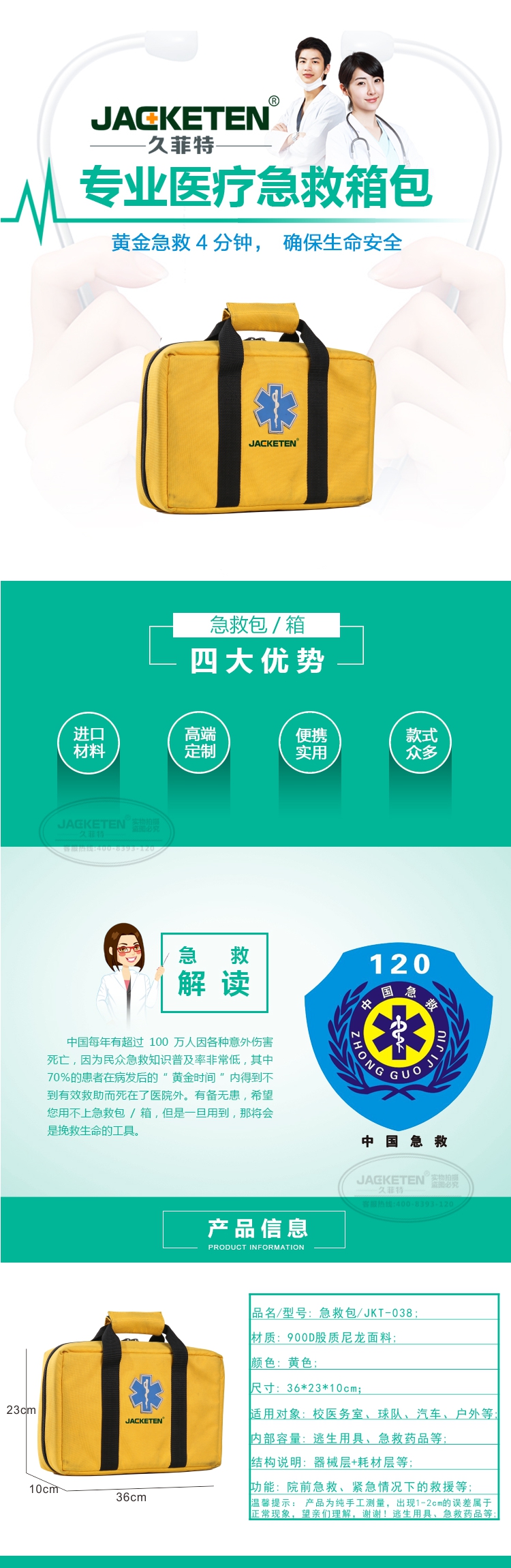 品名/貨號:急救包/JKT-038;材質(zhì):900D股質(zhì)尼龍面料;顏色:紅色;尺寸:36*23*10cm;適用對象:校醫(yī)務(wù)室、球隊(duì)、汽車戶外等;內(nèi)部容量:逃生用具、急救藥品等;結(jié)構(gòu)說明:器械層+耗材層;功能:院前急救、緊急情況下的救援等